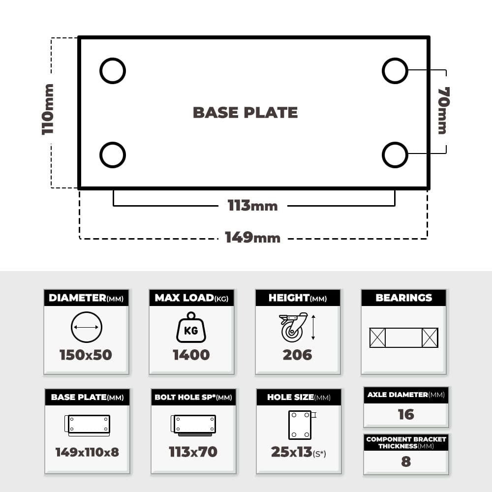 EXTREME HEAVY DUTY fabricated steel componentry with black zinc finish for corrosion resistance. Full cast iron, double ball bearing core centered wheel. Suitable for use on automotive assembly lines, aviation trolleys and in production manufacturing plants.