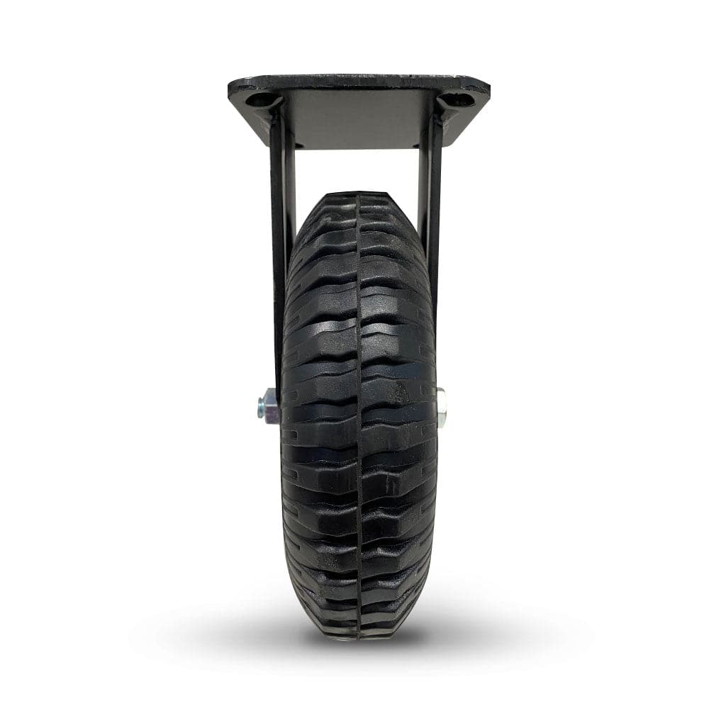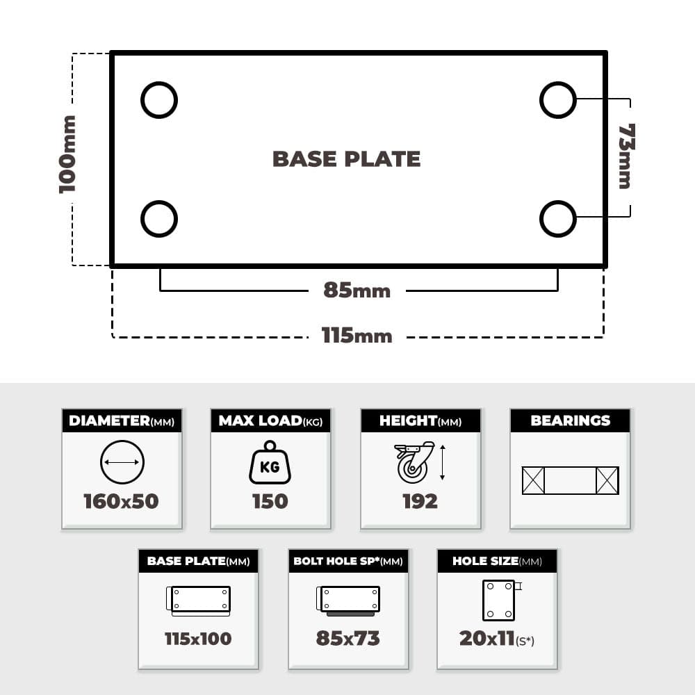 Black baked enamel finished fabricated steel componentry with steel core centred, solid rubber outer wheel with double ball bearings.
