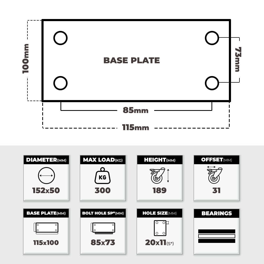 Gal plated fabricated steel componentry with polypropylene core centred, roller bearing wheel with moulded polyurethane outer.