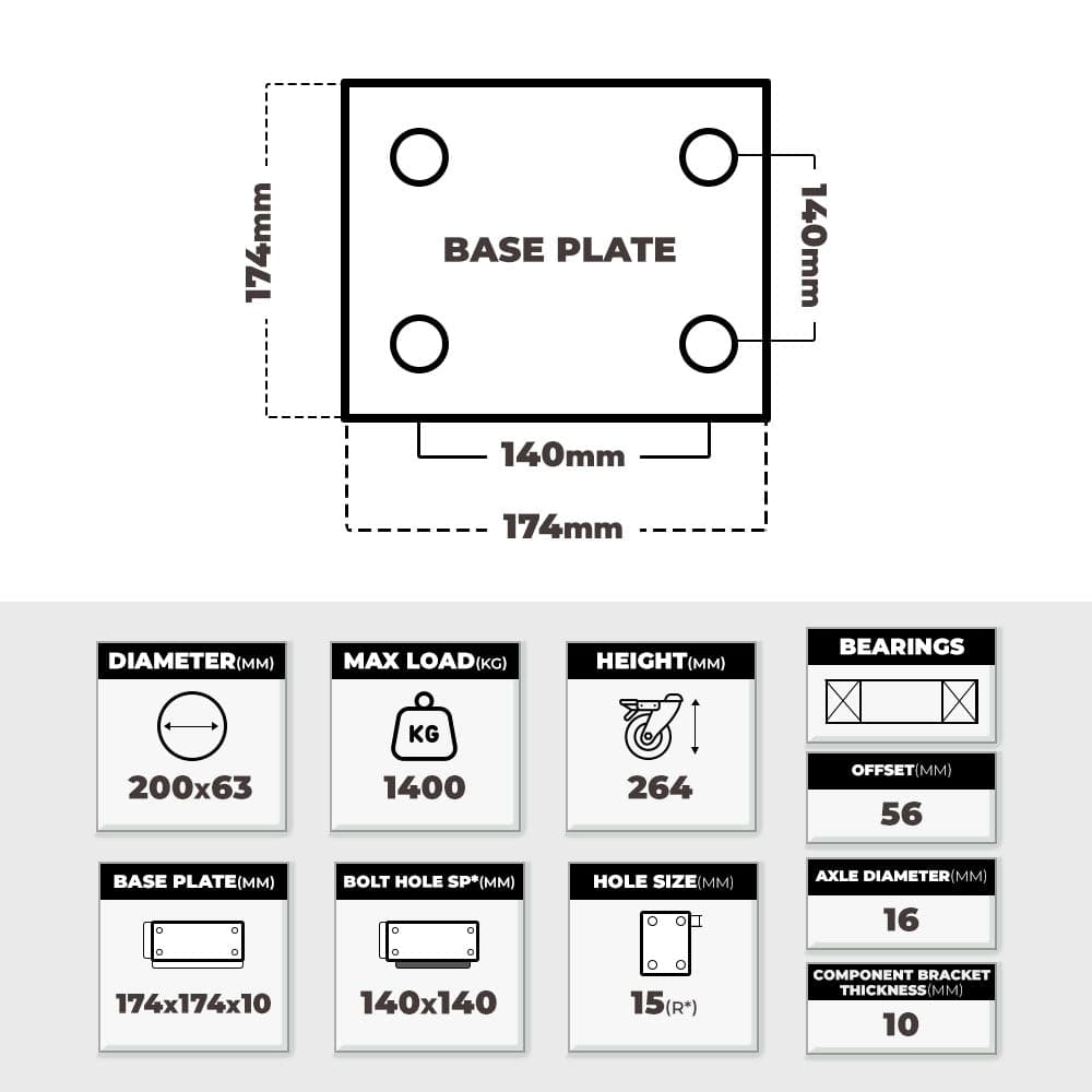Grip 41952 200mm 1400kg Heavy Duty Poly Cast Iron Swivel Castor