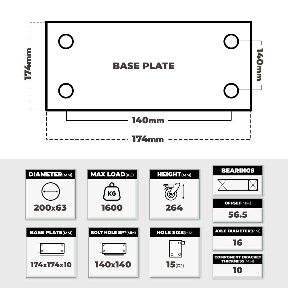 EXTREME HEAVY DUTY fabricated steel componentry with black zinc finish for corrosion resistance. Full cast iron, double ball bearing core centered wheel. Suitable for use on automotive assembly lines, aviation trolleys and in production manufacturing plants.