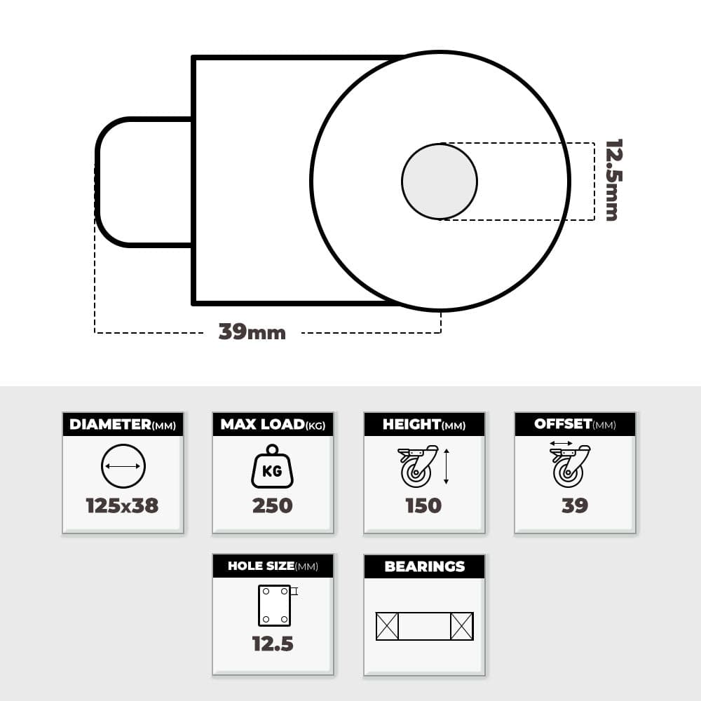 Gal plated pressed steel componentry with one piece hard nylon castor wheel and quality tapered roller bearing with 2 piece dust cover. Ideal for multipurpose applications.