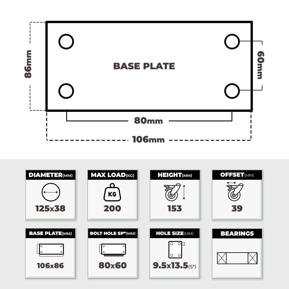 Pressed steel gal plated componentry with polypropylene core centred tapered roller bearing wheel with moulded polyurethane outer and 2 piece dust cover.