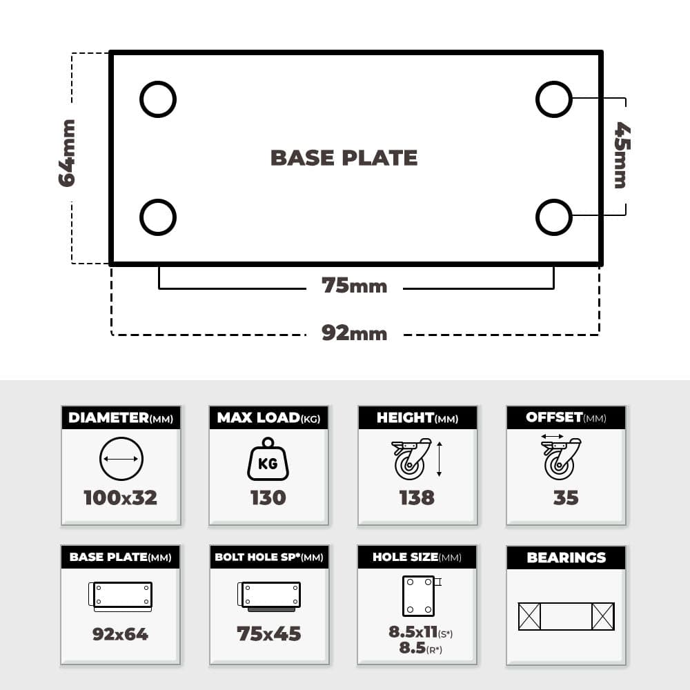 Grip 42075 100mm 130kg Chrome Plated Grey TPR Swivel Castor with Brake
