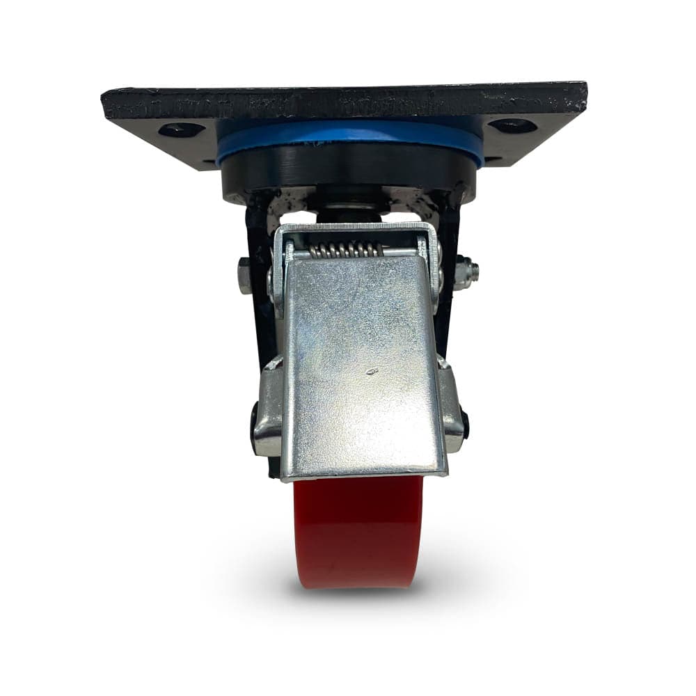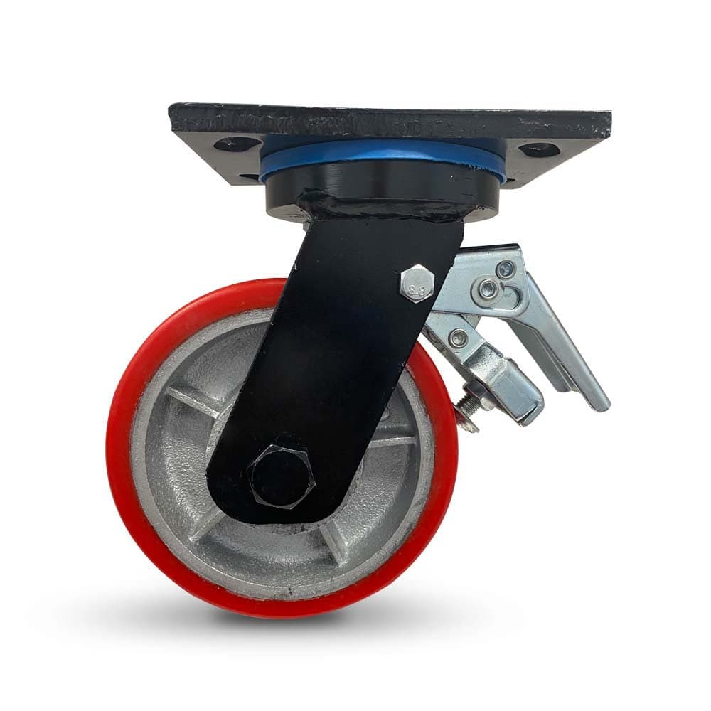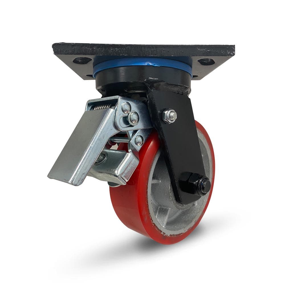 EXTREME HEAVY DUTY fabricated steel componentry with black zinc finish for corrosion resistance. Cast iron double ball bearing core centred wheel with moulded polyurethane outer. Suitable for mobile platforms, heavy machinery, warehouse equipment, transport and logistics applications that require the shock protection of the moulded polyurethane outer and a towable option.