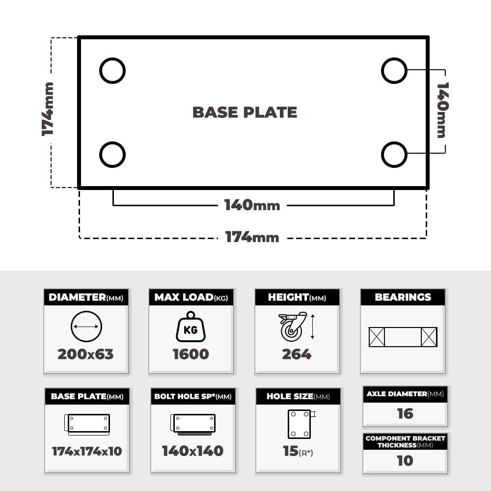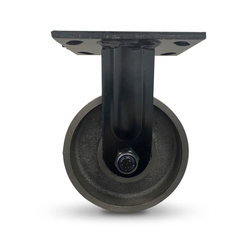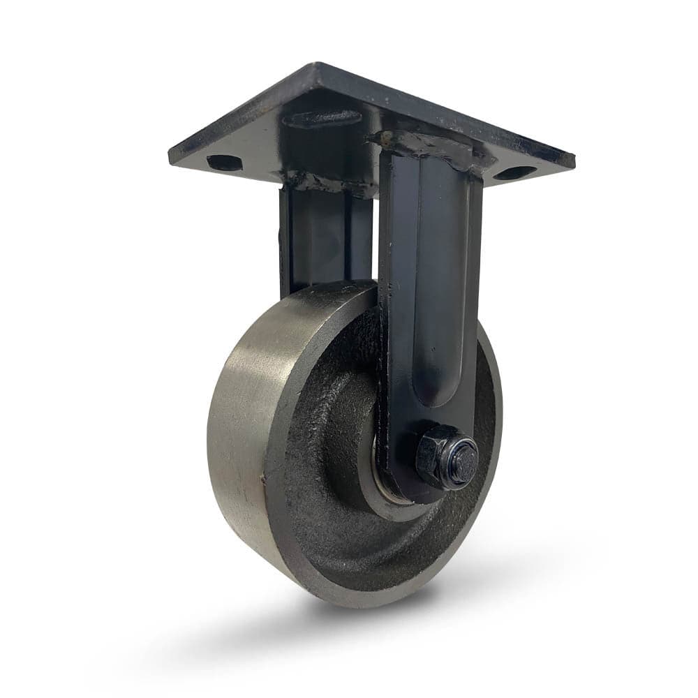 EXTREME HEAVY DUTY fabricated steel componentry with black zinc finish for corrosion resistance. Full cast iron, double ball bearing core centered wheel. Suitable for use on automotive assembly lines, aviation trolleys and in production manufacturing plants.
