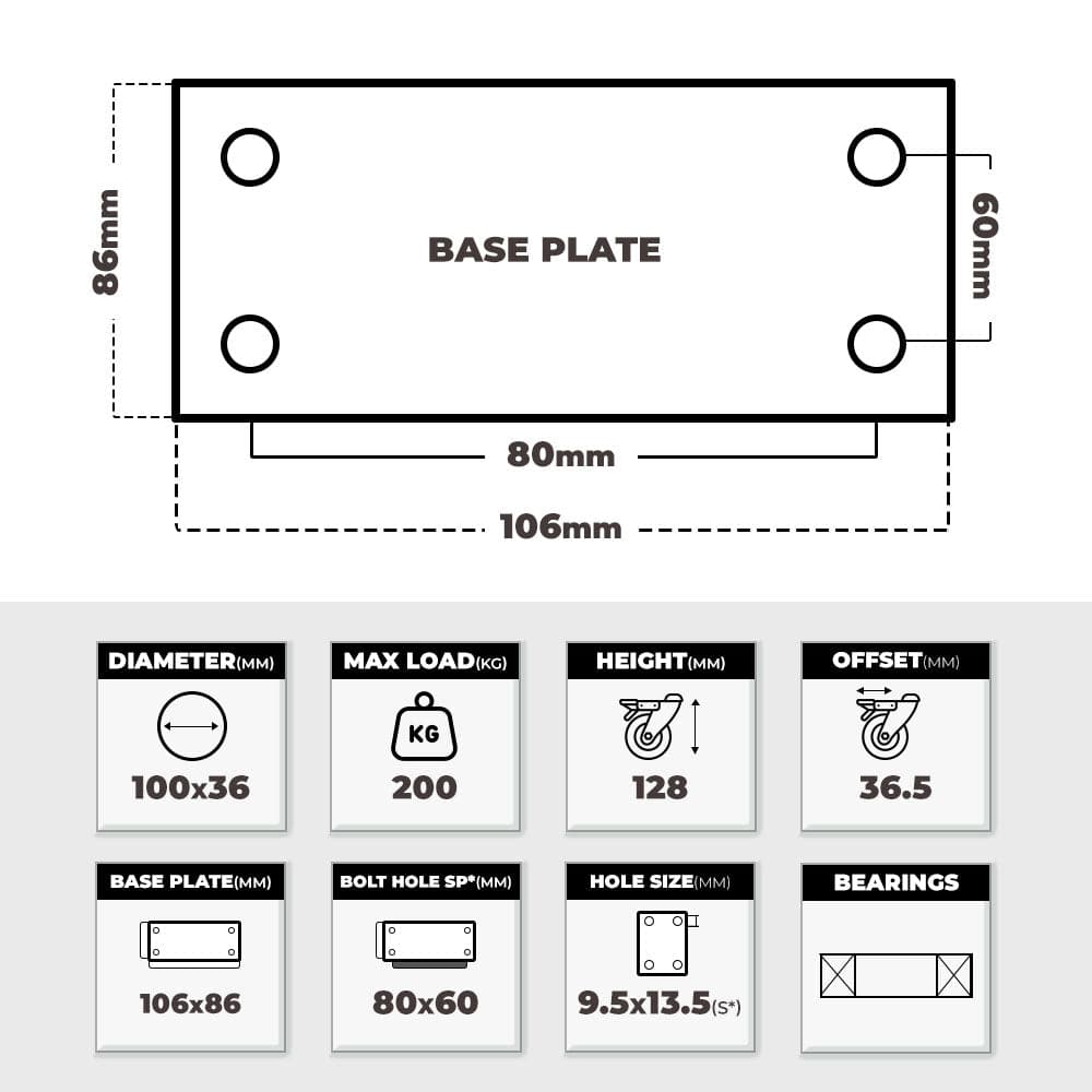 Gal plated pressed steel componentry with one piece hard nylon castor wheel and quality tapered roller bearing with 2 piece dust cover. Ideal for multipurpose applications
