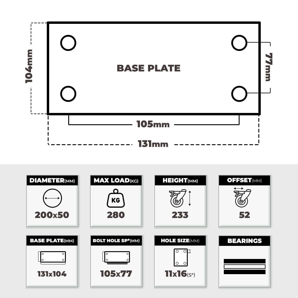 Grip 42068 200mm 280kg Blue Elastic Rubber Swivel Castor
