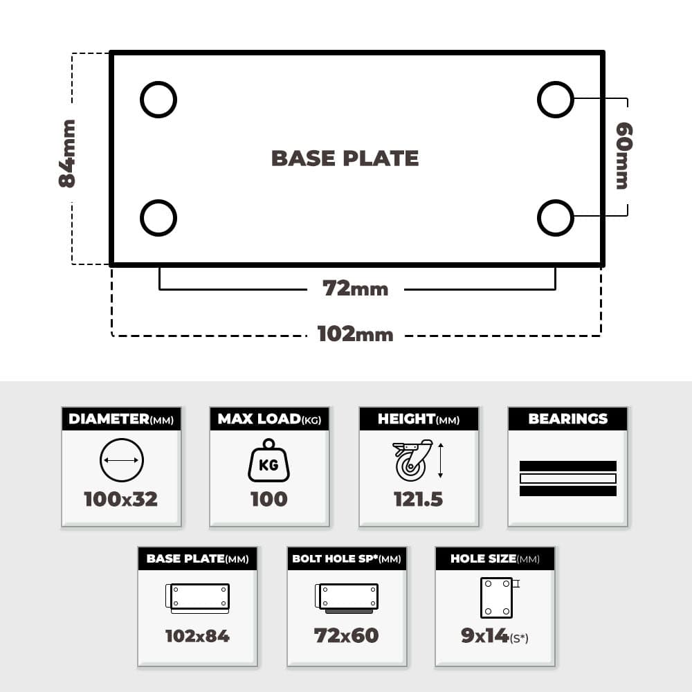 Gal plated pressed steel componentry with nylon core centred blue elastic rubber outer wheels (non marking) with quality roller bearings. Ideal for hospital and shopping centre applications.