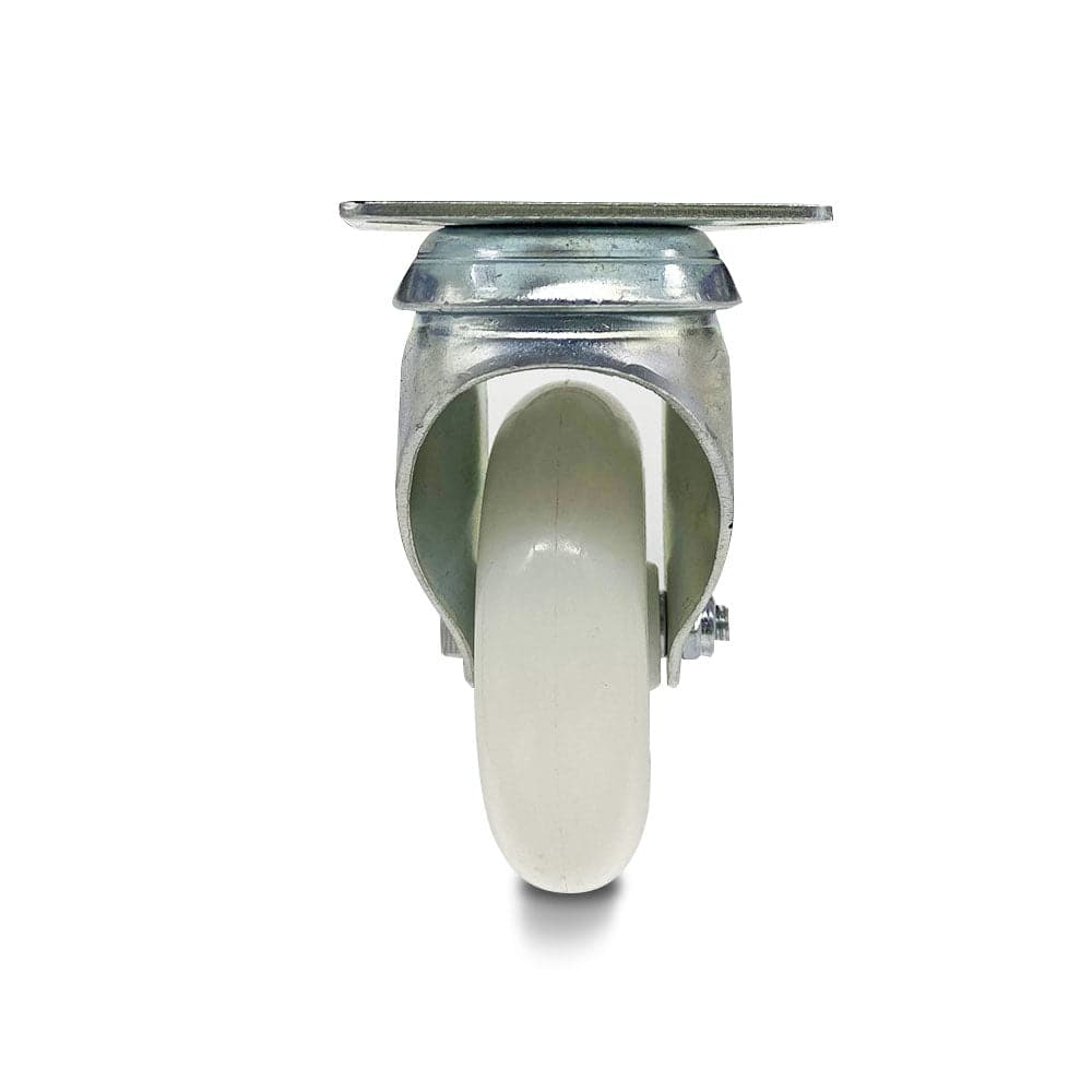 Gal plated pressed steel componentry with white polypropylene core centred ,white nylon outer and plain stock bearings. Lightweight duty, home use applications.