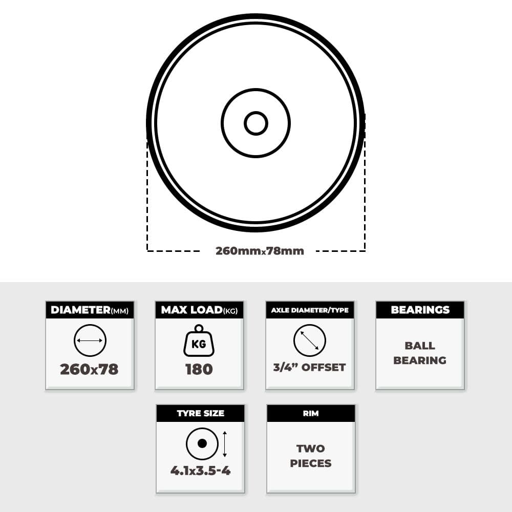 Quality 2 piece, gal plated, pressed steel, some greaseable, rims fitted with flange style ball bearings and lightweight polyurethane foam filled puncture proof tyres.